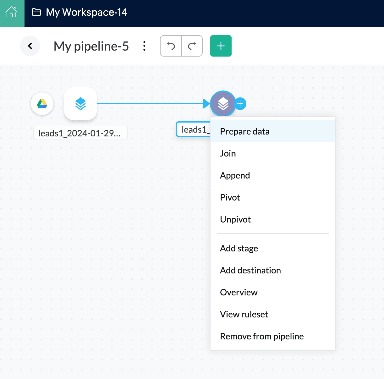 1. Open an existing pipeline or create a pipeline from the Home Page, Pipelines tab, or Workspaces tab and click the Add data option.