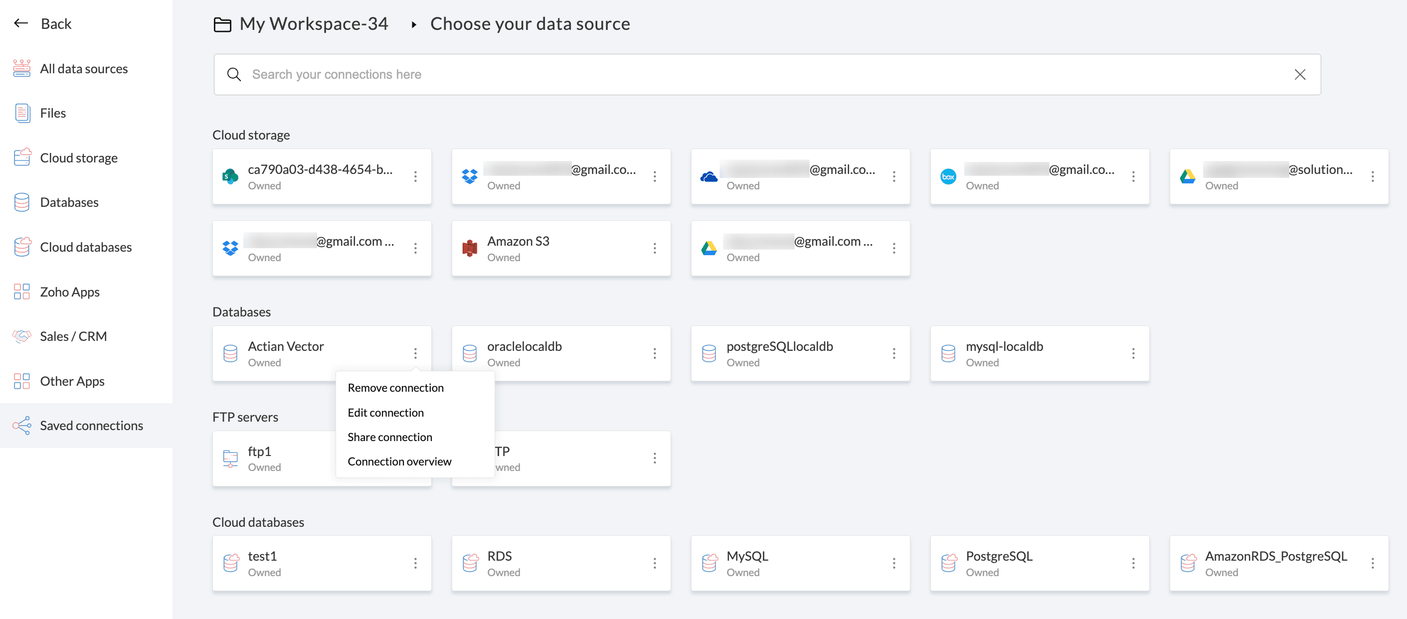 2. You can manage your saved data connections right from the data import screen. Click the ellipsis (3 dots) icon to share, edit, view the connection overview, or remove the connection.