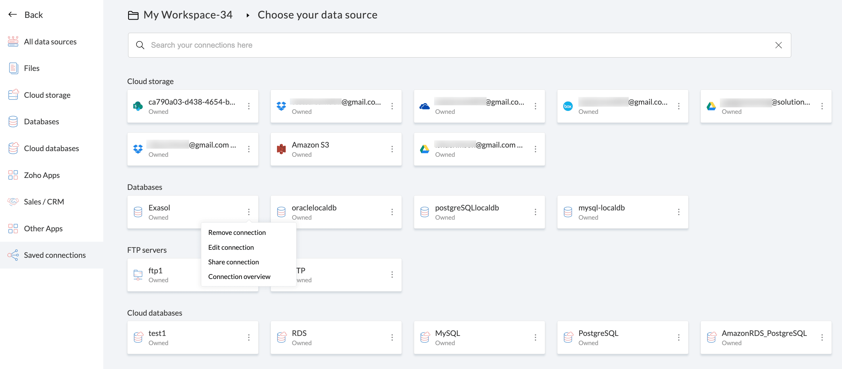 DataPrep saves your data connections to avoid the hassle of keying in the credentials every time you need to connect to a data source or destination. You can always edit the saved data connection and update them with new parameters or credentials using the Edit connection option.