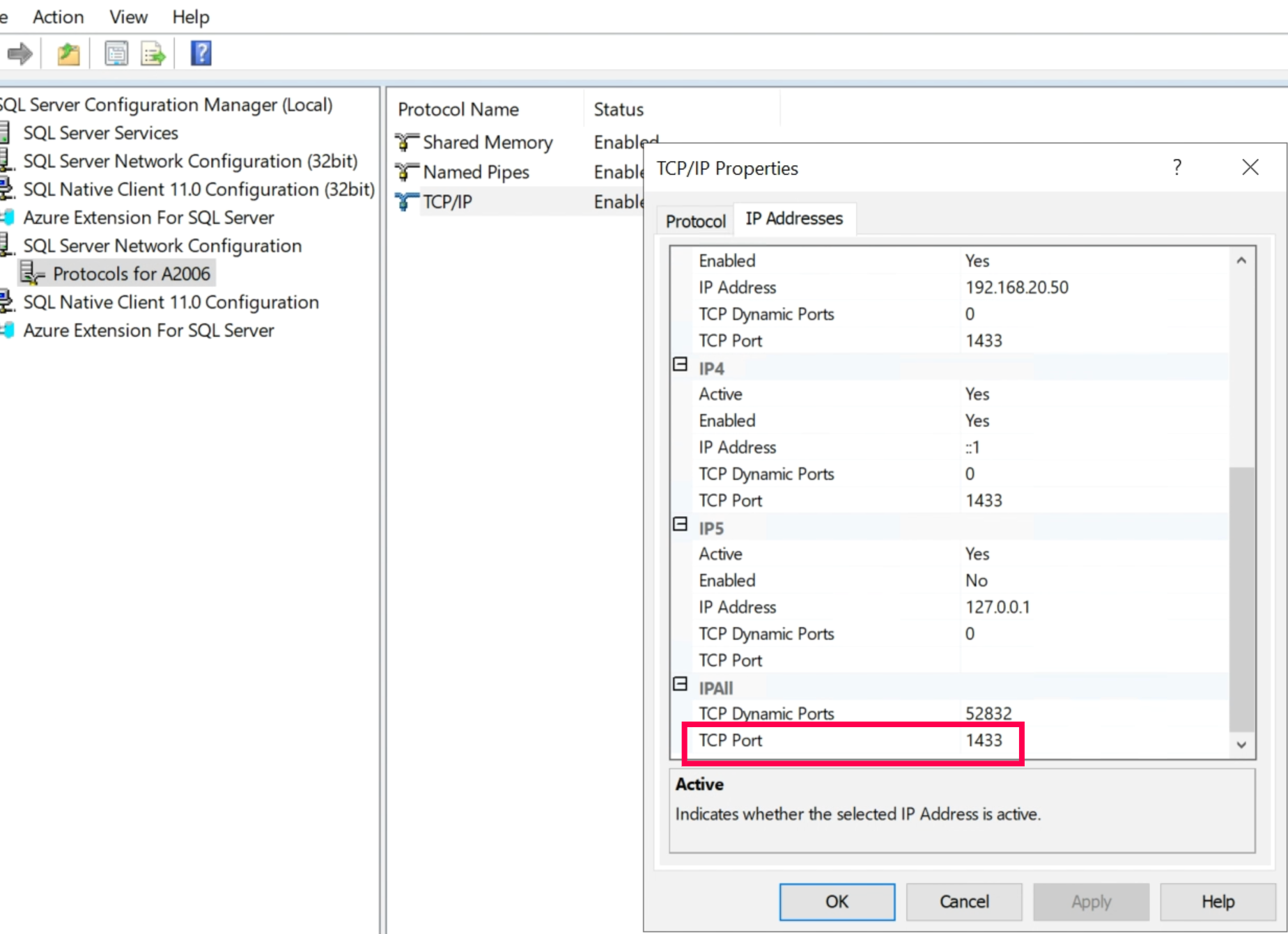5. Right-click on TCP/IP, navigate to Properties and head to the IP Addresses tab. Ensure the Active and Enabled fields are set to 'Yes', and configure the TCP/IP Port. Click OK to proceed.