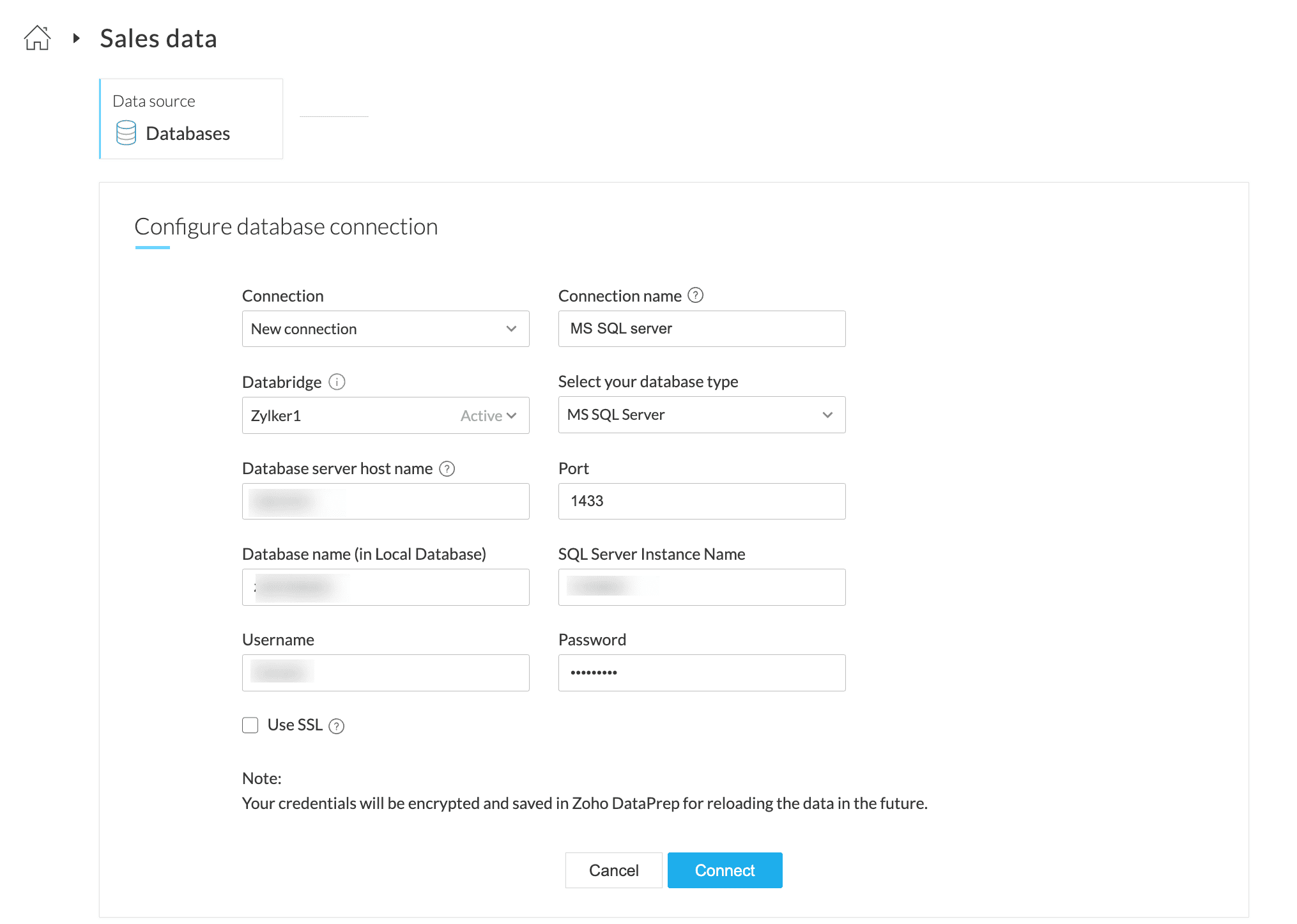 Note: You can also select the Use SSL checkbox if your database server has been setup to serve encrypted data through SSL.