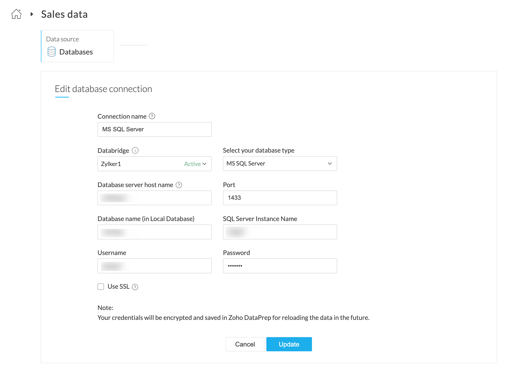 DataPrep saves your data connections to avoid the hassle of keying in the credentials every time you need to connect to a data source or destination. You can always edit the saved data connection and update them with new parameters or credentials using the Edit connection option.