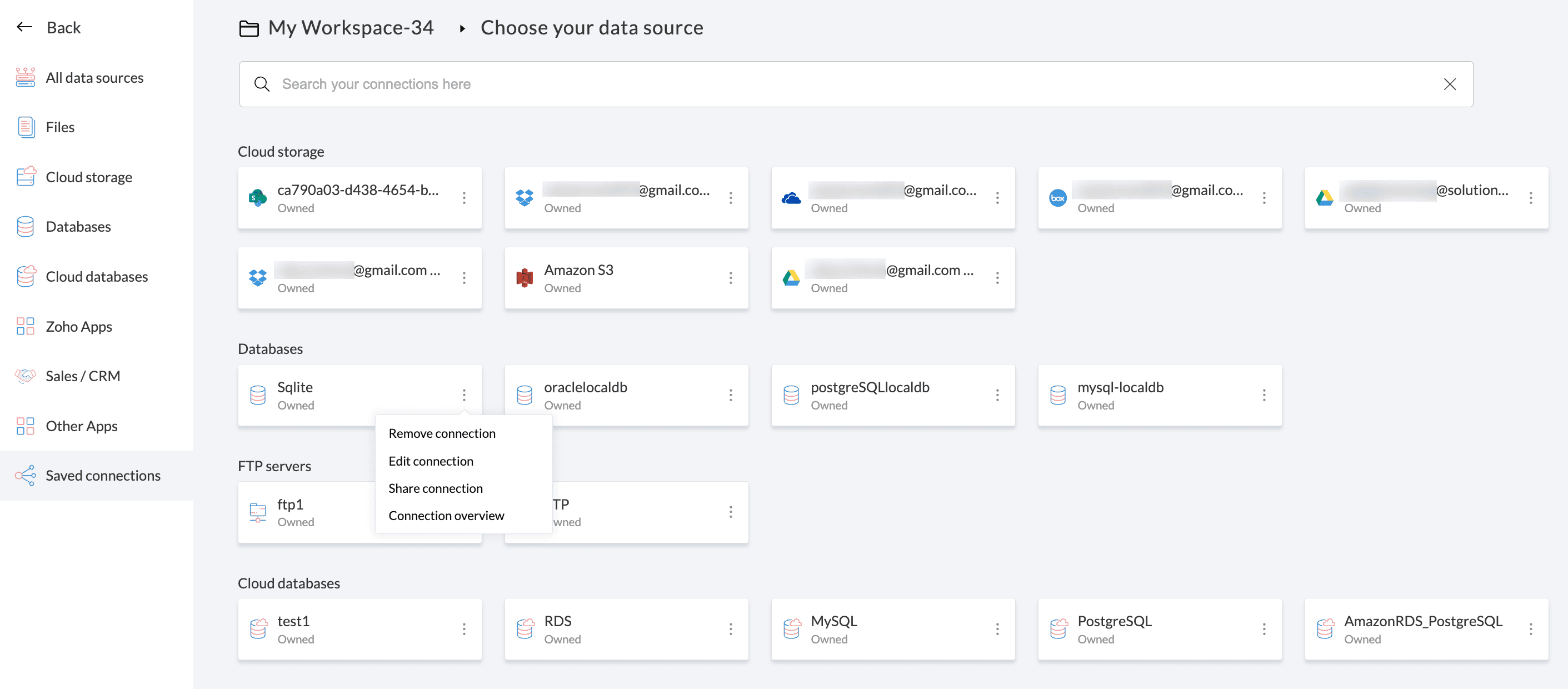 2. You can manage your saved data connections right from the data import screen. Click the ellipsis (3 dots) icon to share, edit, view the connection overview, or remove the connection.