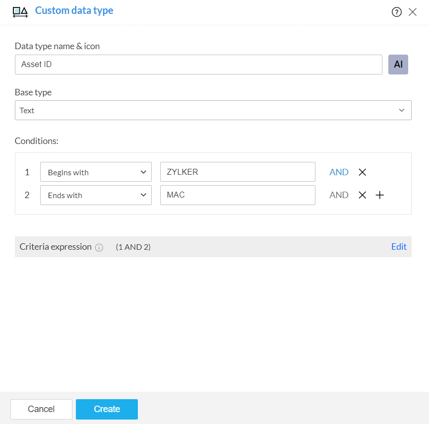 The pattern consists of the text 'ZYKLER' at the beginning, followed by an unique six-digit number and the text 'MAC' at the end. The data type "AssetID" can be created using the begins with and ends with conditions, and the AND operator to join the two conditions.