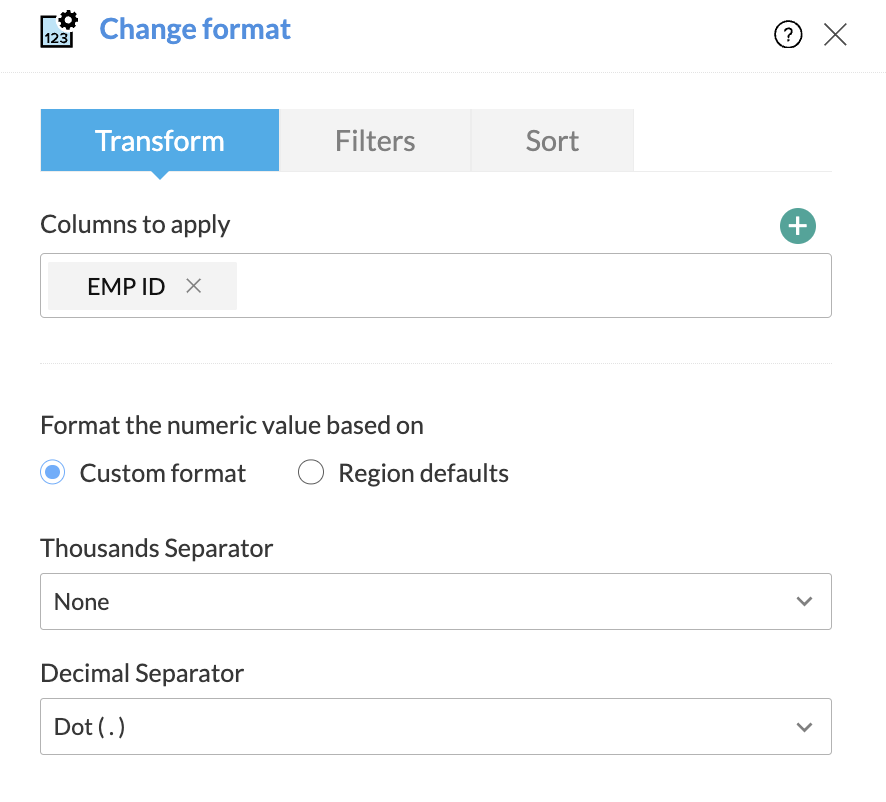 3. Choose  Custom format  to create your own format with a decimal separator and thousands separator. A live preview will be shown when you change the options in the transform panel.