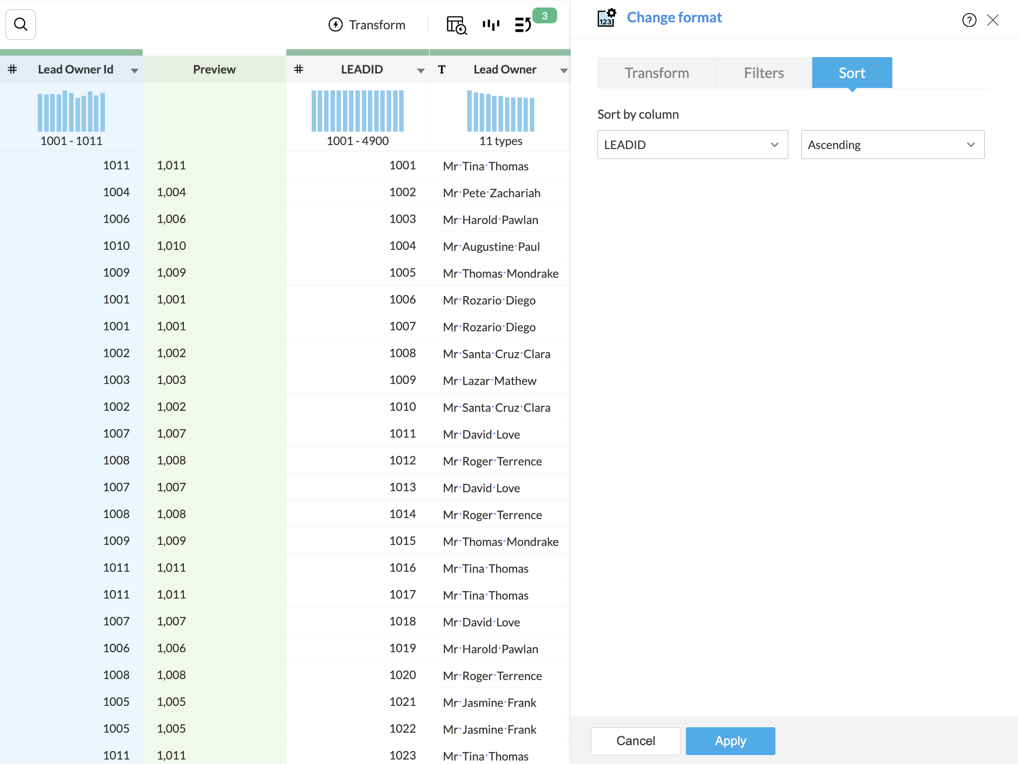 Under the Sort tab, you can sort data in the ascending or descending order based on any column. You can choose the column in the Sort by column drop down and choose the order to be sorted.
