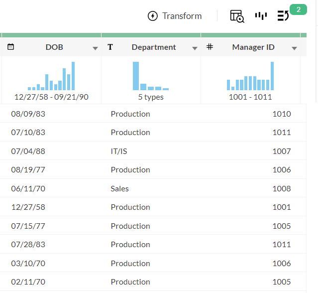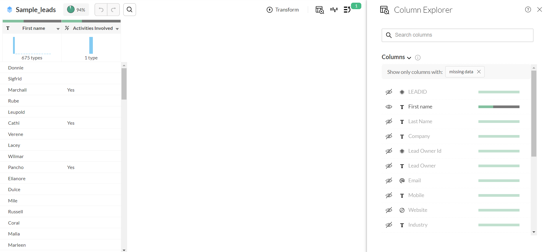 The Column Explorer in Zoho DataPrep allows you to search, navigate and control the viewing options of the columns in a dataset. You can search and filter columns with invalid or missing data and fix them quickly. This helps you focus on the columns that matter.