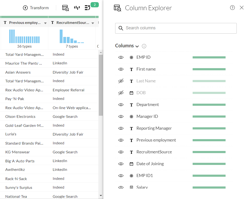 2. Click on the eye icon  to  Hide/show columns in the list of columns shown in the Column Explorer panel.