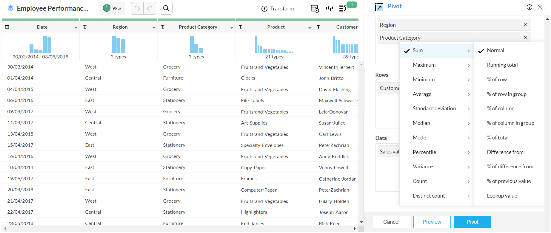 Boolean | Count | Normal Running total % of row % of row in group % of column % of column in group % of total Difference from % of difference from % of previous value Lookup value |