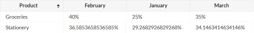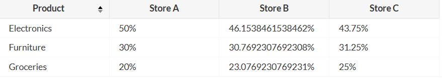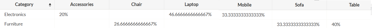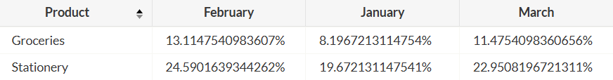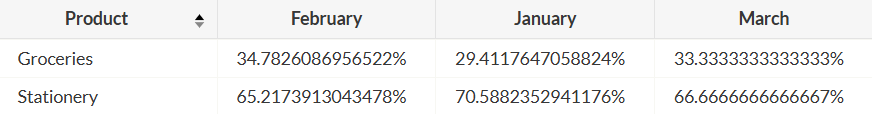 % of column in a group | Returns the total value of each row within a group as a percentage. |