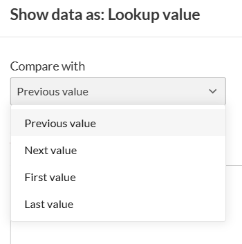 Lookup | Returns the value from any of the previous, next, first or last cell based on the Base field selected. |