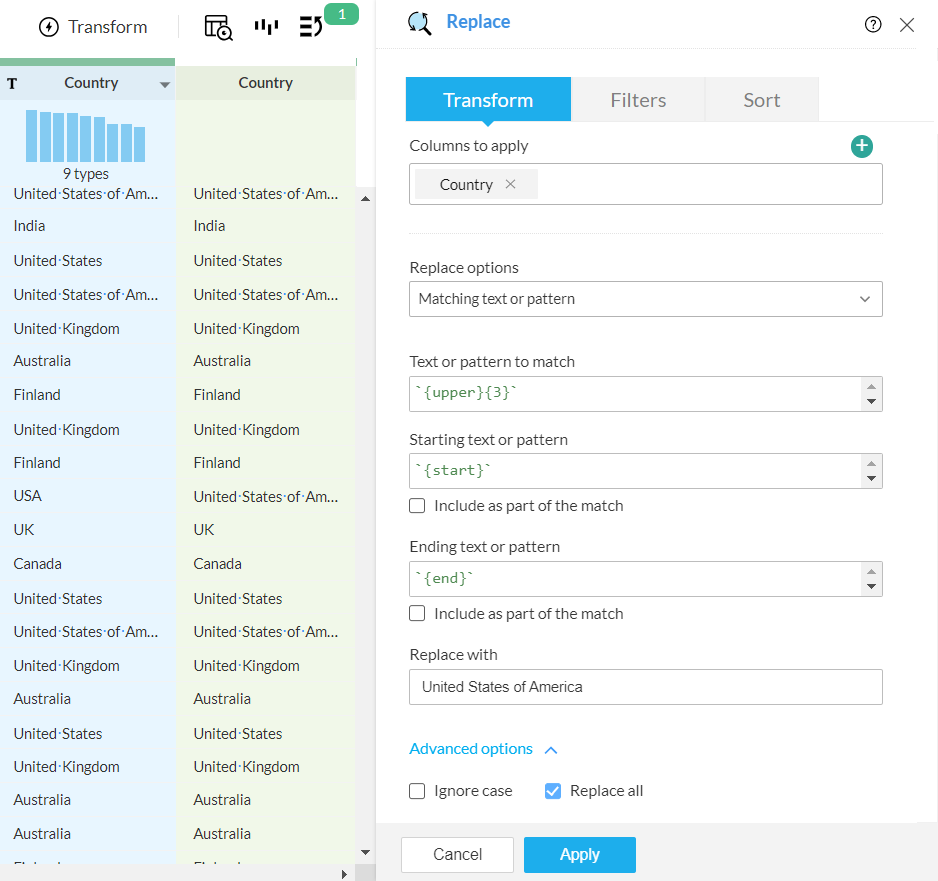 2. DataPrep offers several advanced matching options to make it easier to find a value from your column data. The options available under Replace options are: