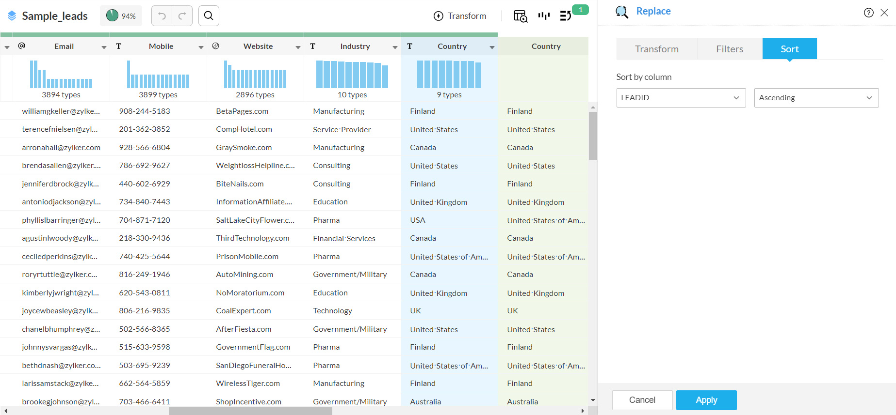 Under the Sort tab, you can sort data in the ascending or descending order based on any column. You can choose the column in the Sort by column drop down and choose the order to be sorted.