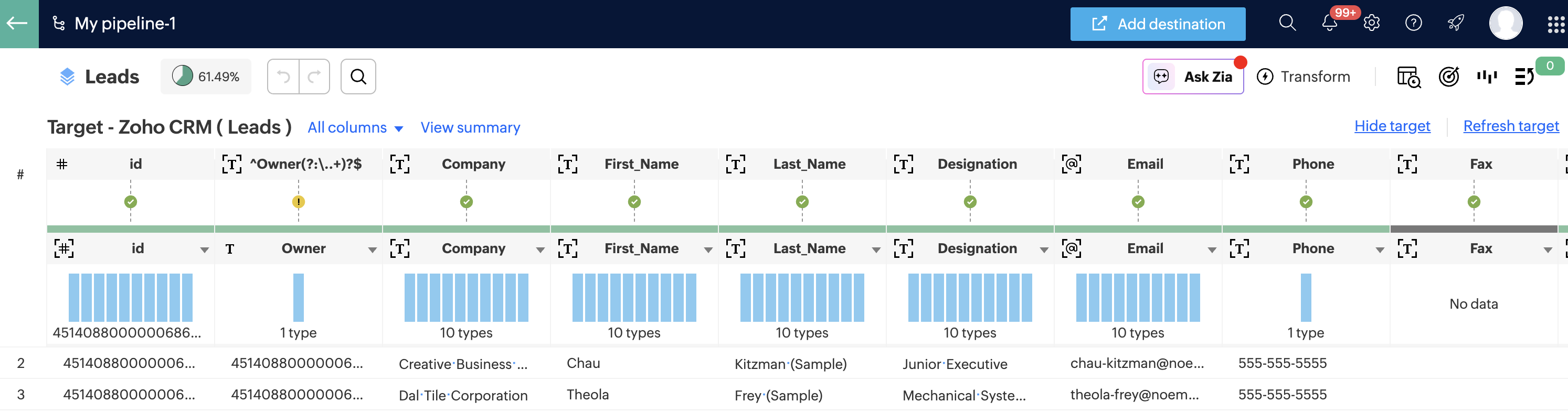 This adds the required data types and constraints to your stage columns so they match your target columns in Zoho CRM.