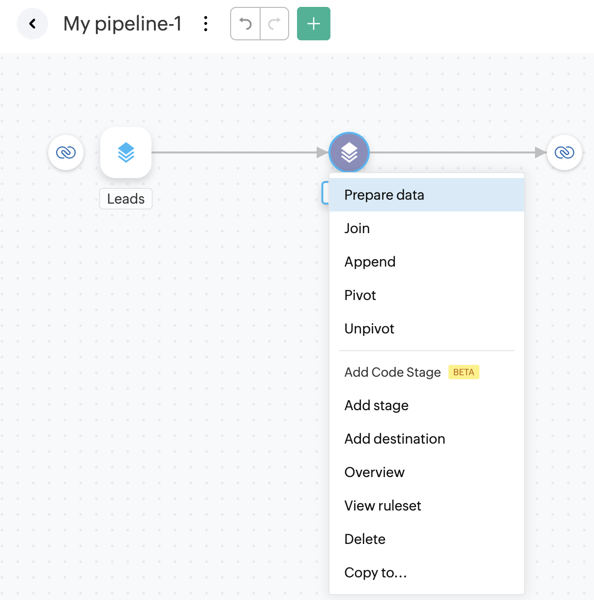 b. Right click the last stage (to which you’ve added Zoho CRM as destination) and choose the Prepare Data option. This opens the DataPrep Studio page.