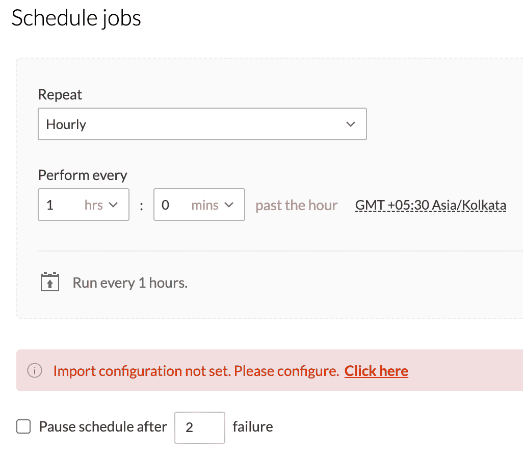 While configuring the Schedule, Manual reload, Backfill, Webhooks, or Zoho Flow, the import configuration needs to be mandatorily setup for all the sources. Without setting up the import configuration, the run cannot be saved.