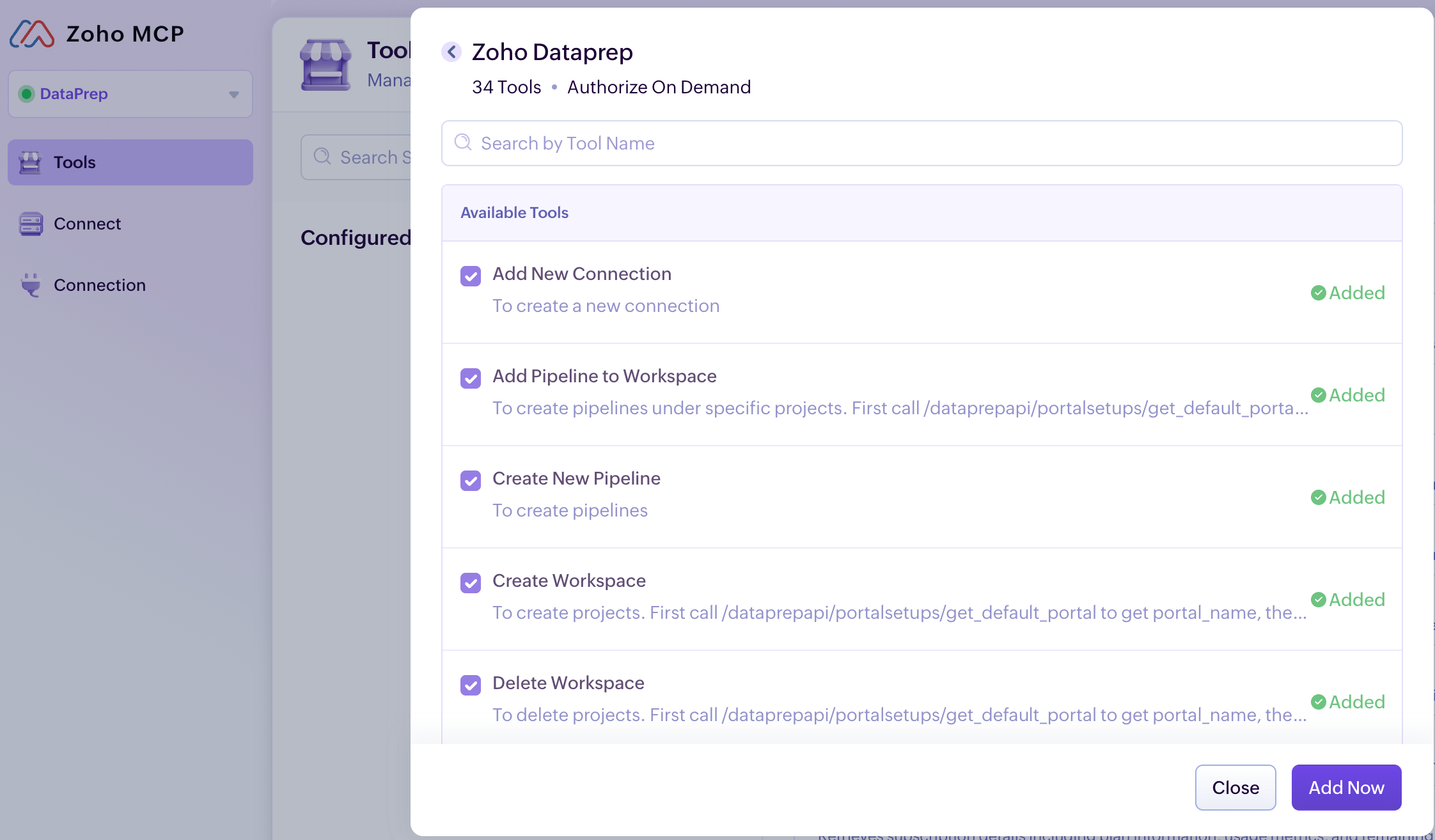Zoho DataPrep Model Context Protocol (MCP) server enables teams to prepare, transform, import, and export data using conversational AI. It allows you to interact with Zoho DataPrep through natural language from AI interfaces like Claude without manually navigating the UI or writing API calls. You can create pipelines, manage stages, execute pipelines, and fetch results simply by describing what you want. Zoho DataPrep MCP is built on the Zoho MCP framework, so you must access Zoho MCP and configure a server to enable DataPrep as an MCP tool. Click here to learn more about Zoho MCP