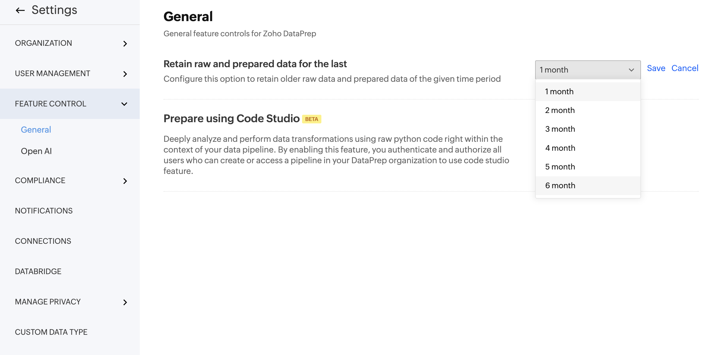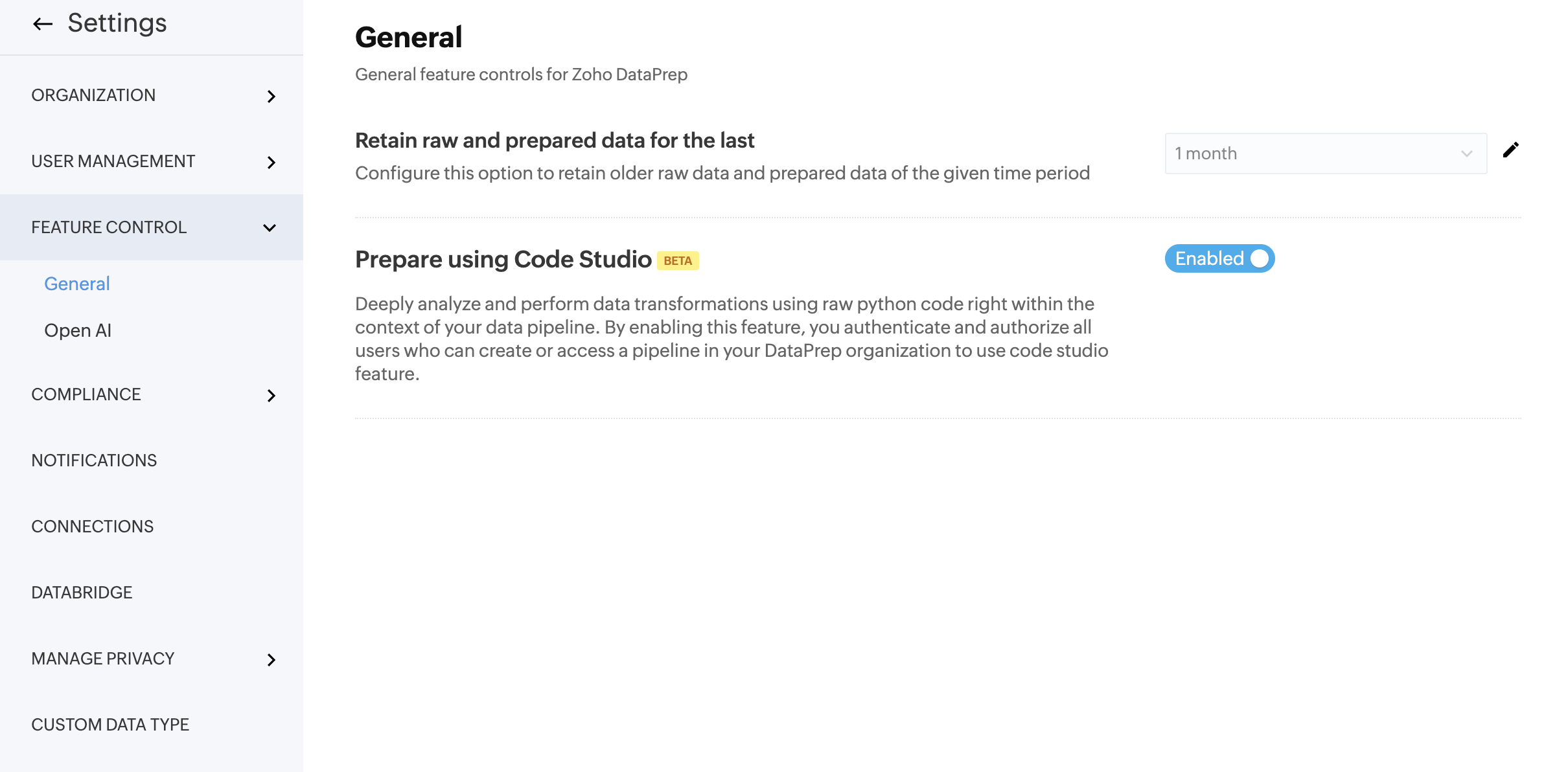 Retain raw and prepared data for the last - Use this setting to specify how long Zoho DataPrep should retain older raw and prepared data.