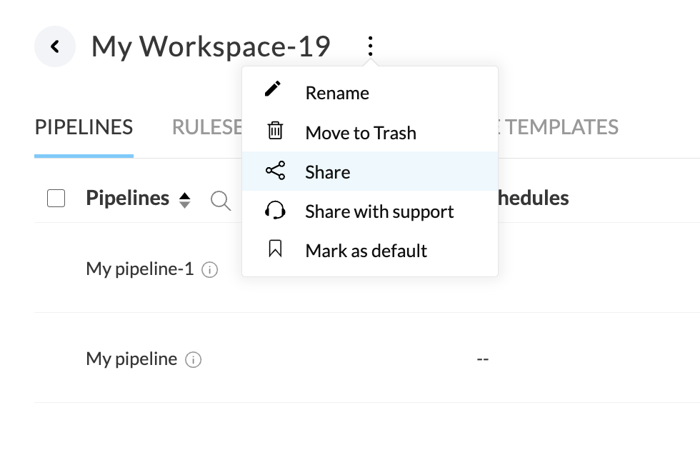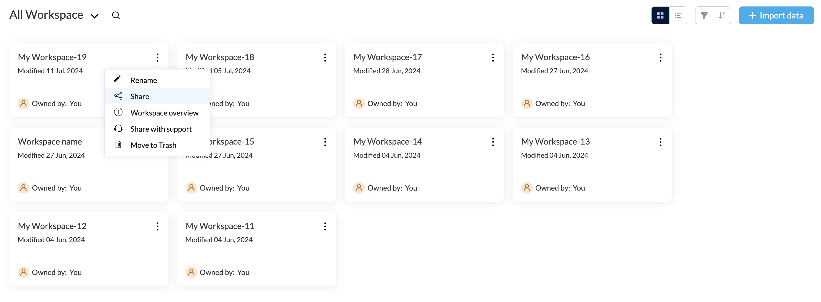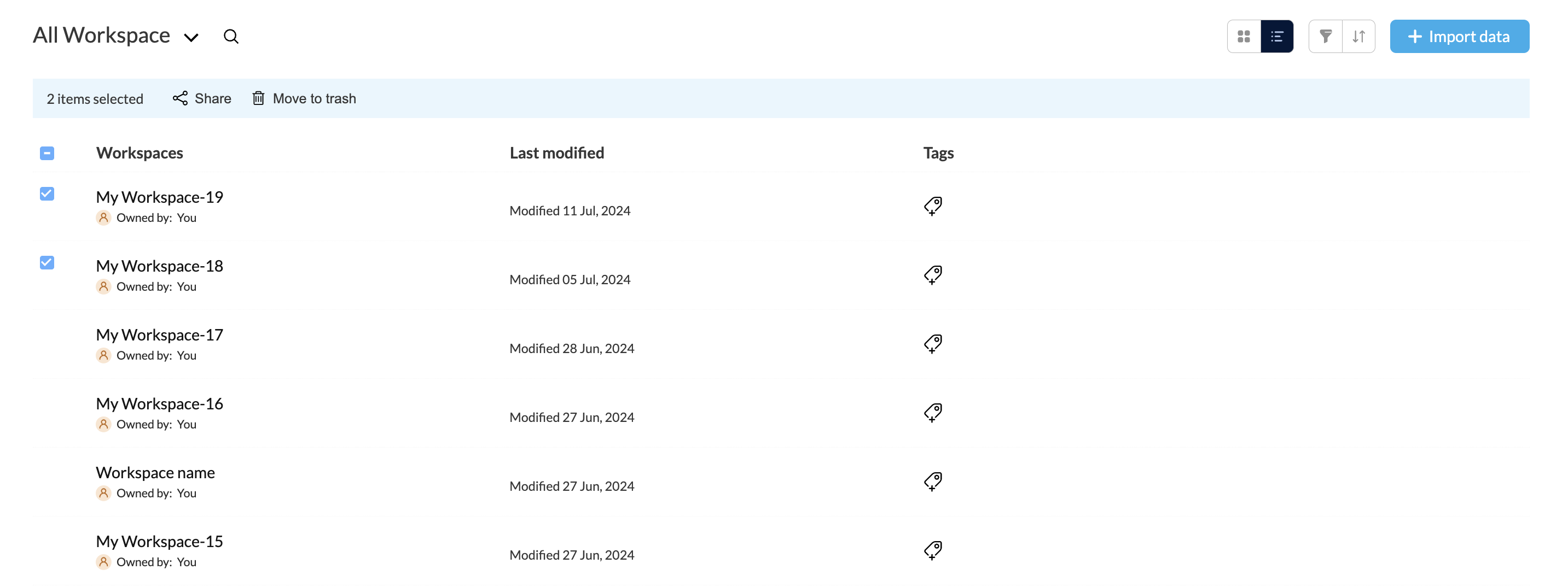 5. Click Share to share your workspace with the users or groups. The workspace has been successfully shared. You can also use the Edit option under Shared details to make changes or remove a user or group from accessing the workspace when needed. However, you can manage the access to entities from the User Management tab under Settings.