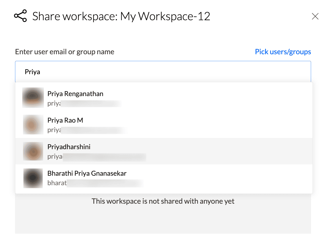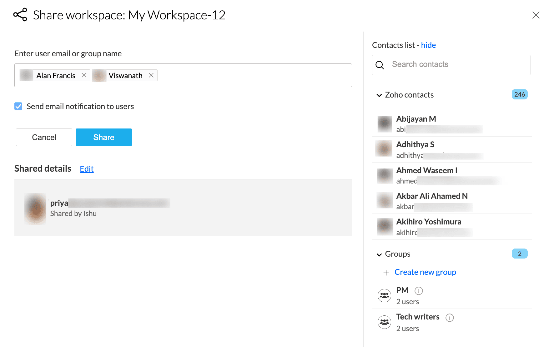 2. You can also add the existing users or groups in your contacts by clicking the Pick users/groups option from the top right corner of the sharing panel.