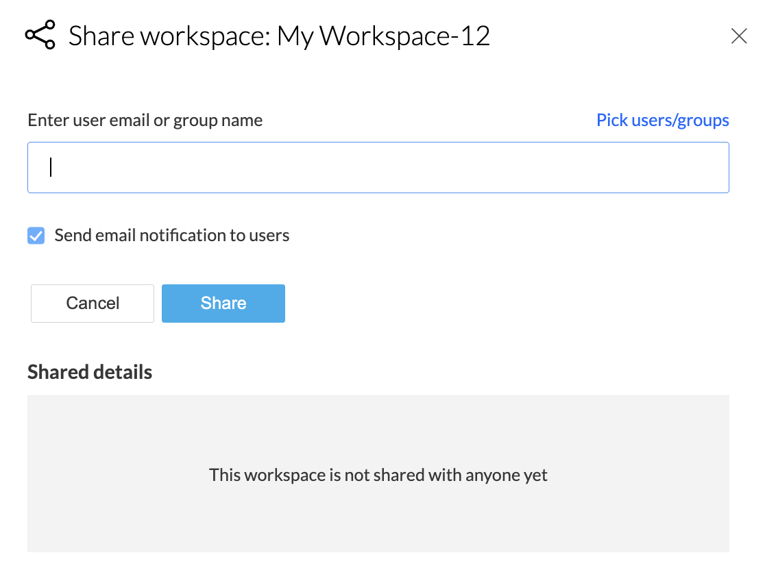 4. Select the Send email notification to users checkbox to send an invitation mail when a workspace is shared with new users or groups.