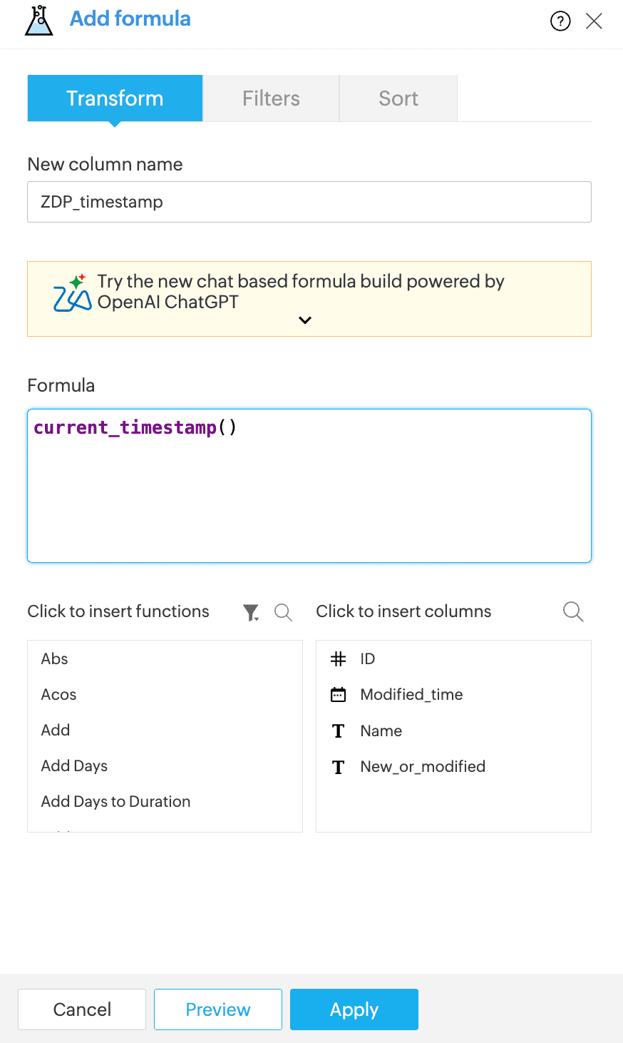 Formula transform to add a new column with timestamp: