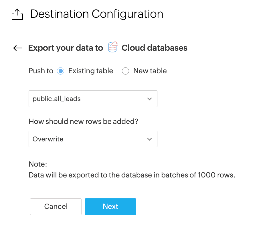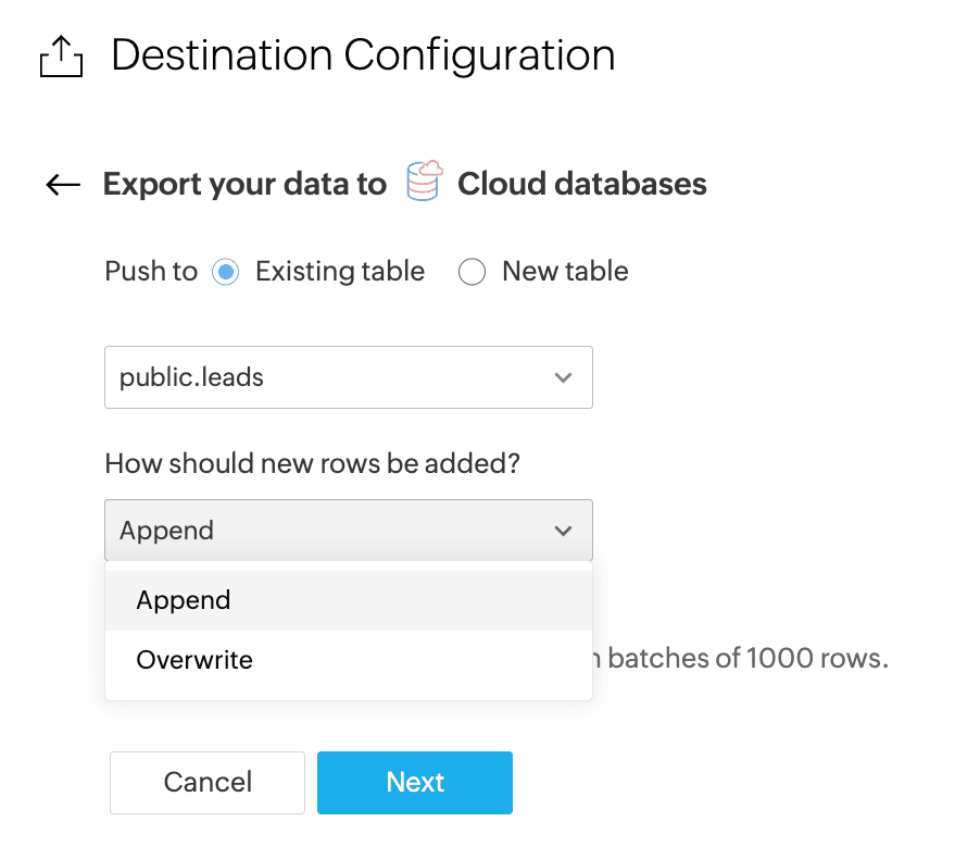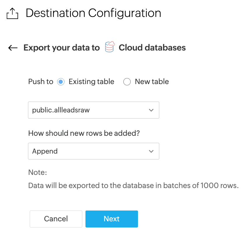 While exporting records to a cloud database, Zoho DataPrep allows you to choose how to add new rows to the table: