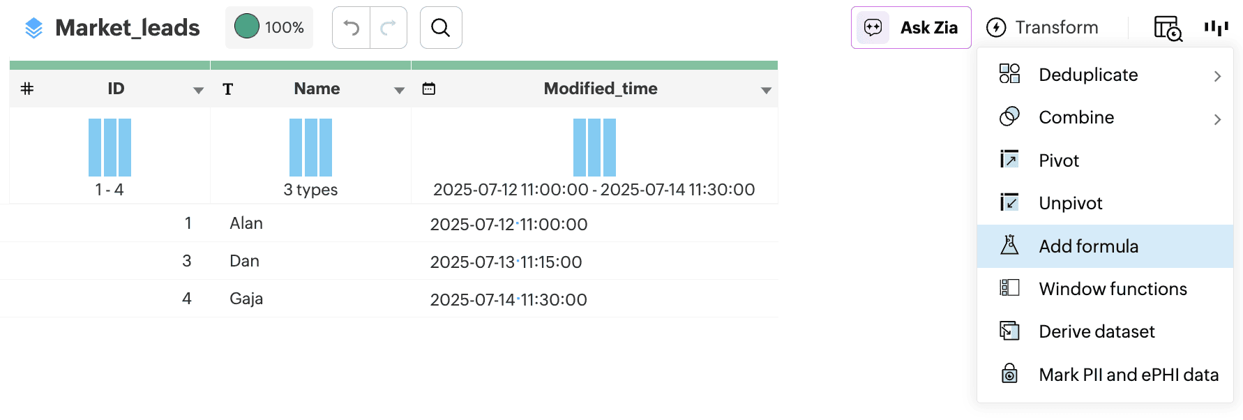 In the market_leads table, add a new column (ZDP_timestamp) with the current timestamp using the Formula function. This will help you track when each new or modified record was last updated from Zoho DataPrep.