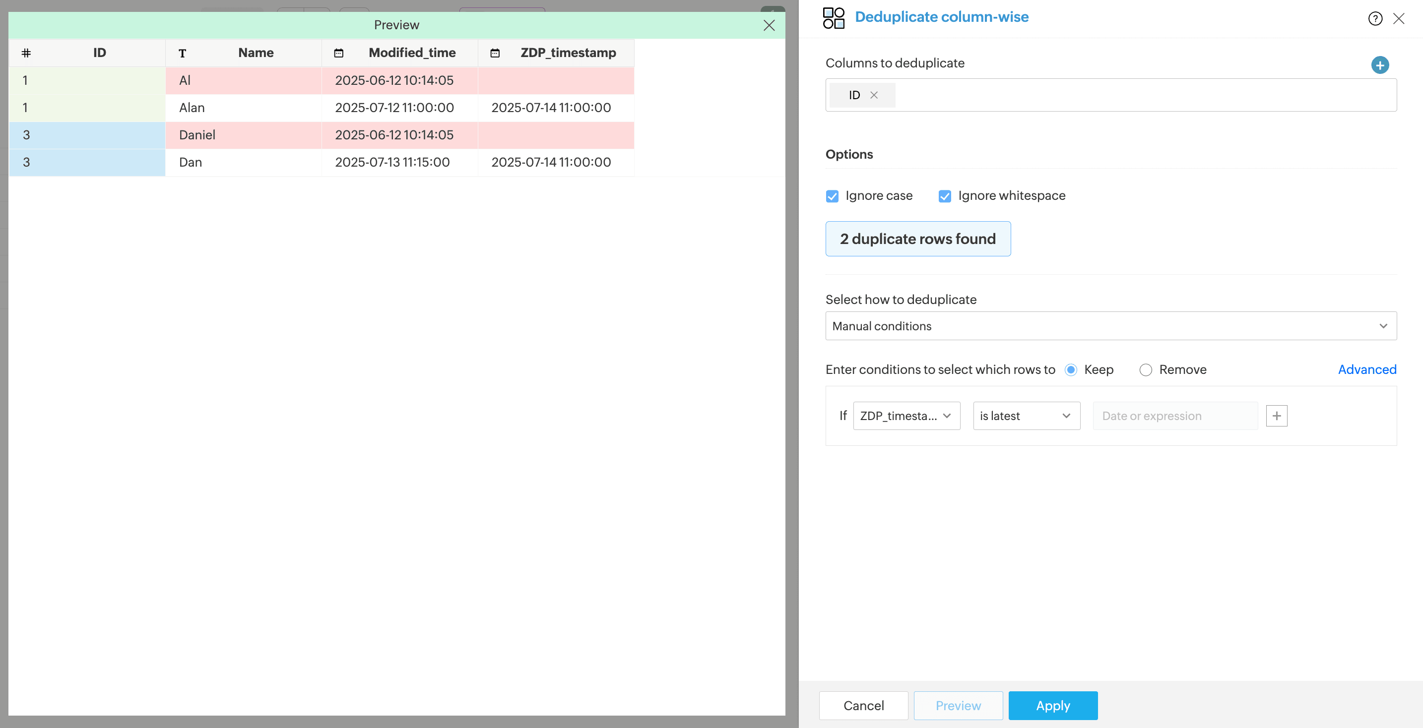 2. Select the ID column to identify duplicates. You can choose to ignore case and whitespace to find duplicates.