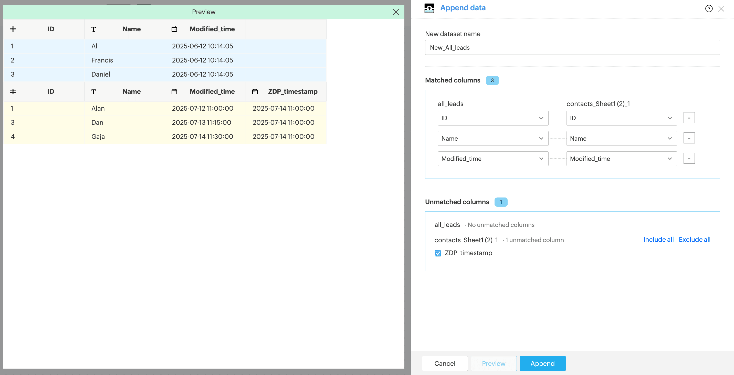 Now append both the tables and include the ZDP_timestamp column.