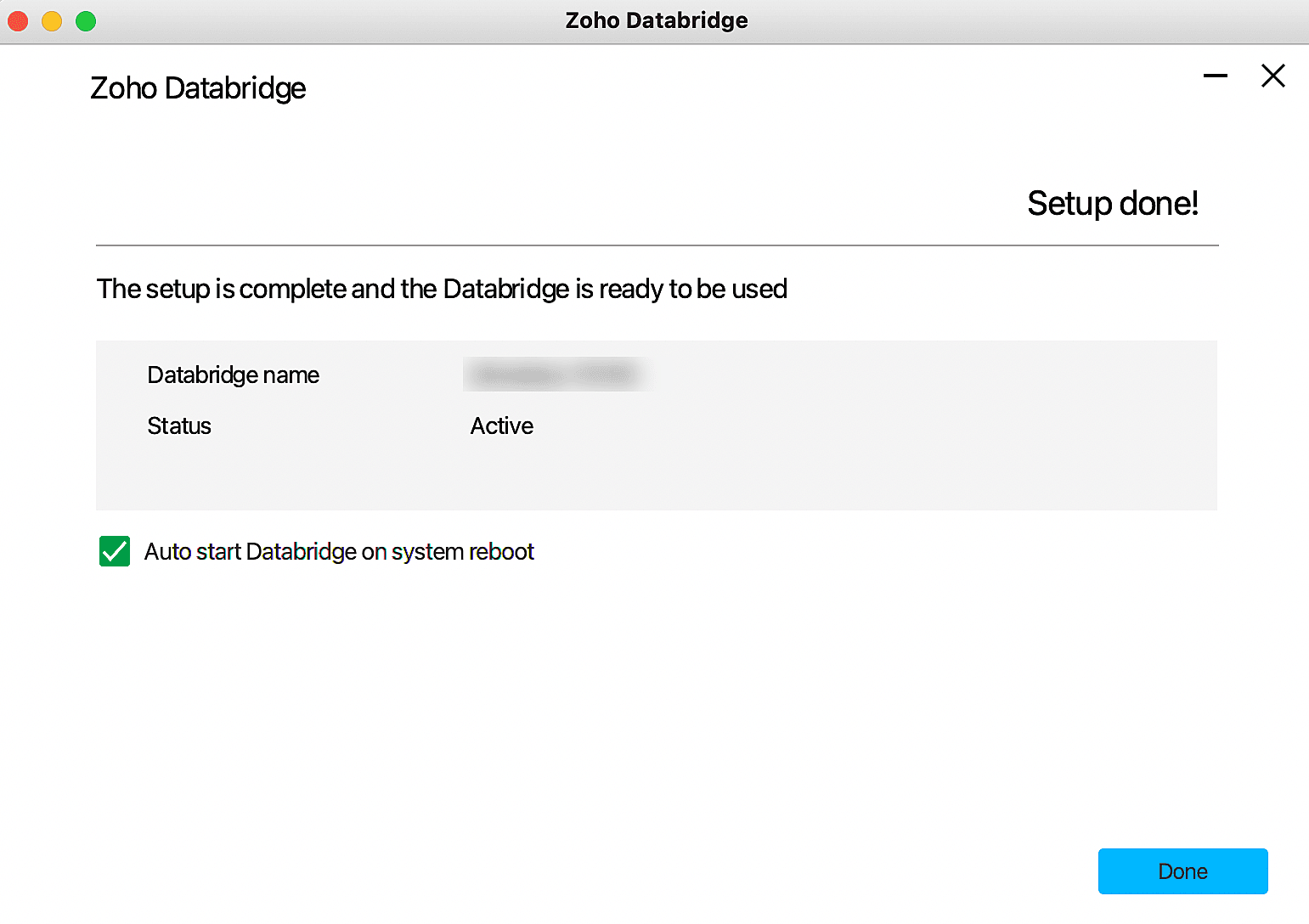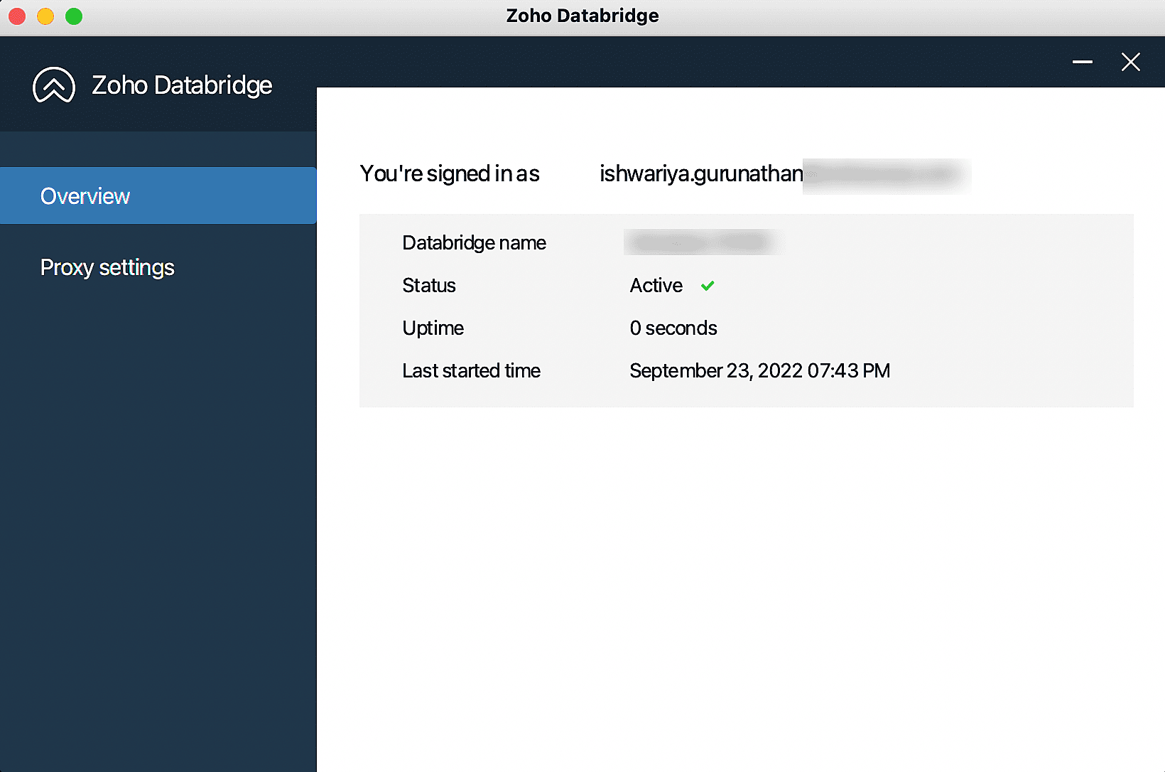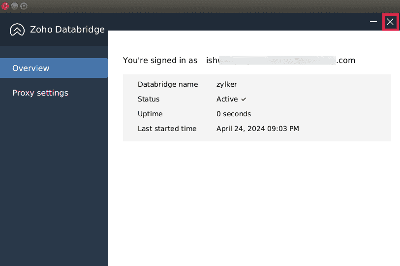 After successful authorization, you can come back to the authorization screen, and you will be logged in to Zoho Databridge with your Zoho account.