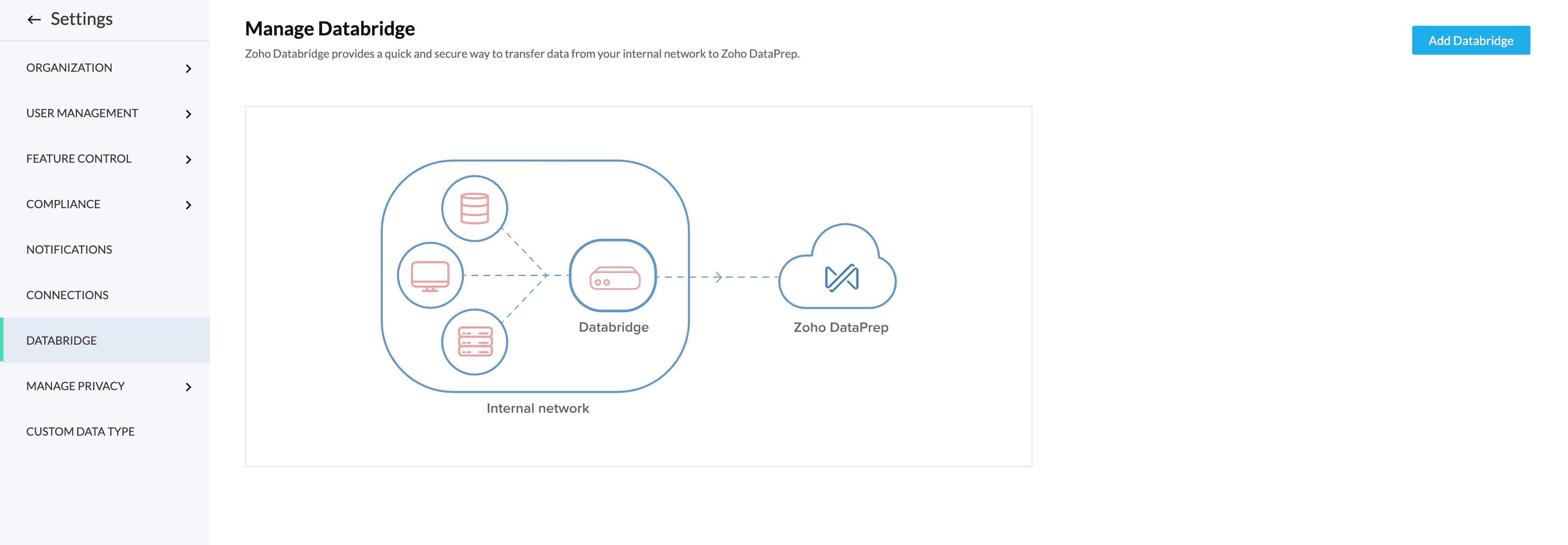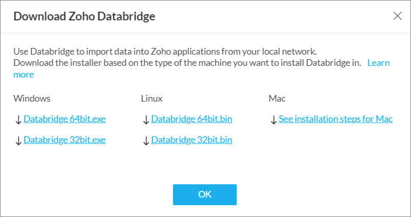 Zoho Databridge is a lightweight independent utility that connects your on-premise data source and Zoho applications to import data. In other words, you can quickly and securely transfer local files and local databases from your internal network to Zoho applications.