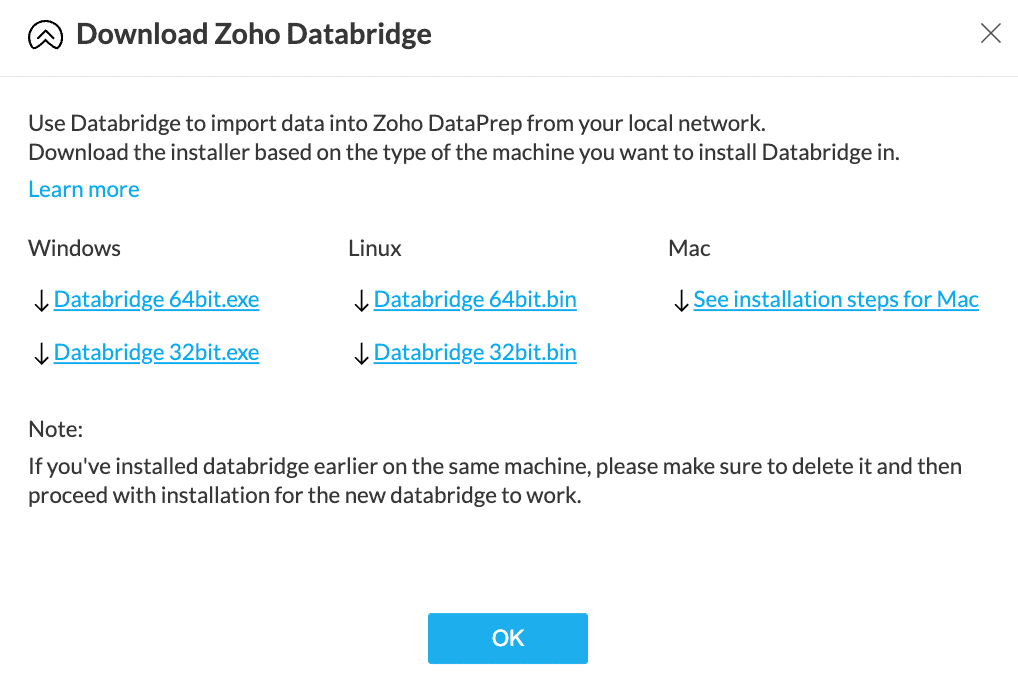 With Zoho DataPrep, you can use Zoho Databridge to allow the import of data from local databases such as MySQL, MS SQL Server, Oracle, and PostgreSQL in your local network and you can also incrementally import data from FTP servers and local files using Zoho Databridge.