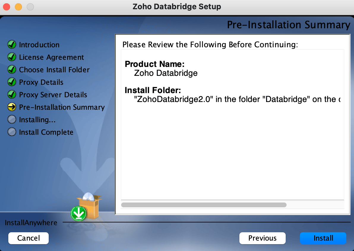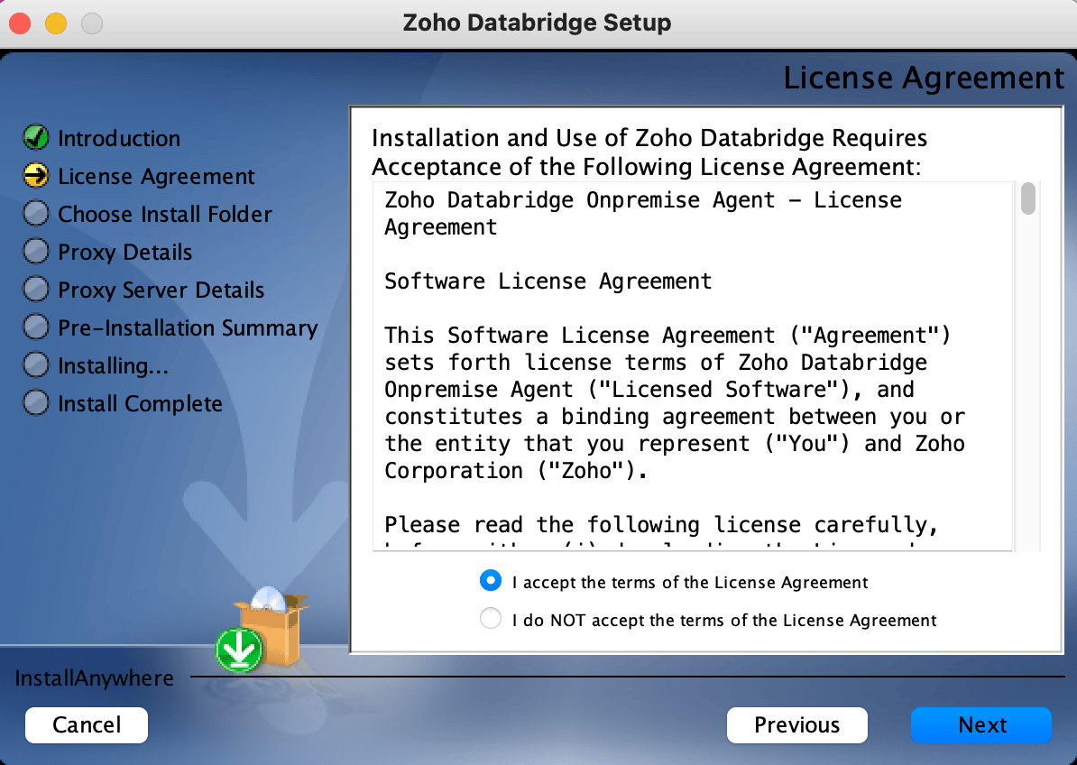 If you have installed Zoho Databridge earlier on the same machine, make sure to uninstall it completely and delete the existing version. You can then proceed with installing the newly downloaded Databridge package.