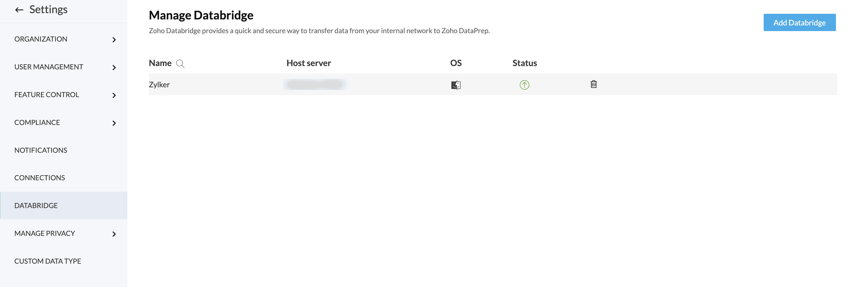 Click Databridges under the Settings page. Click the delete icon to permanently remove the databridge from your organization. Also delete the Zoho Databridge2.0 folder from your machine.