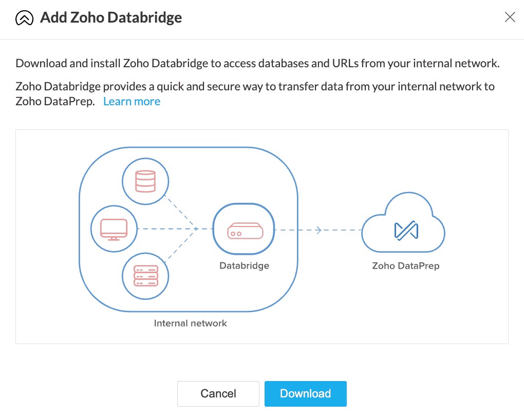 Zoho Databridge solely transfers data from your local network to Zoho DataPrep. It does not retrieve data back to your local network, ensuring no security breach.