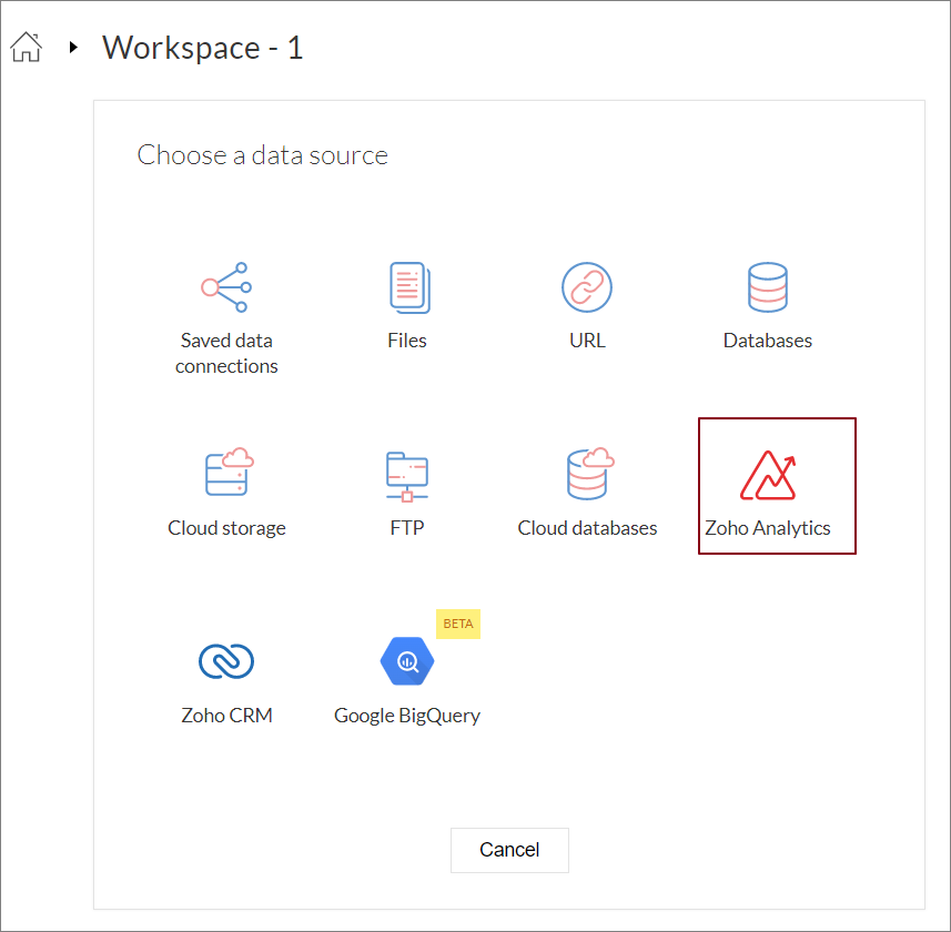 DataPrep supports importing data from Zoho Analytics using the Zoho Analytics connector. Zoho Analytics is a self-service BI and data analytics software that lets you visually analyze your data, create stunning data visualizations and discover hidden insights from your data.