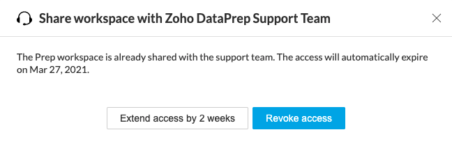 Zoho DataPrep allows you to share your datasets and workspaces with our support team for troubleshooting. Sharing of data with the support team is strictly regulated by