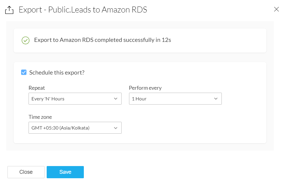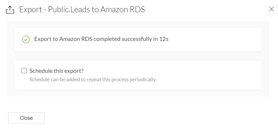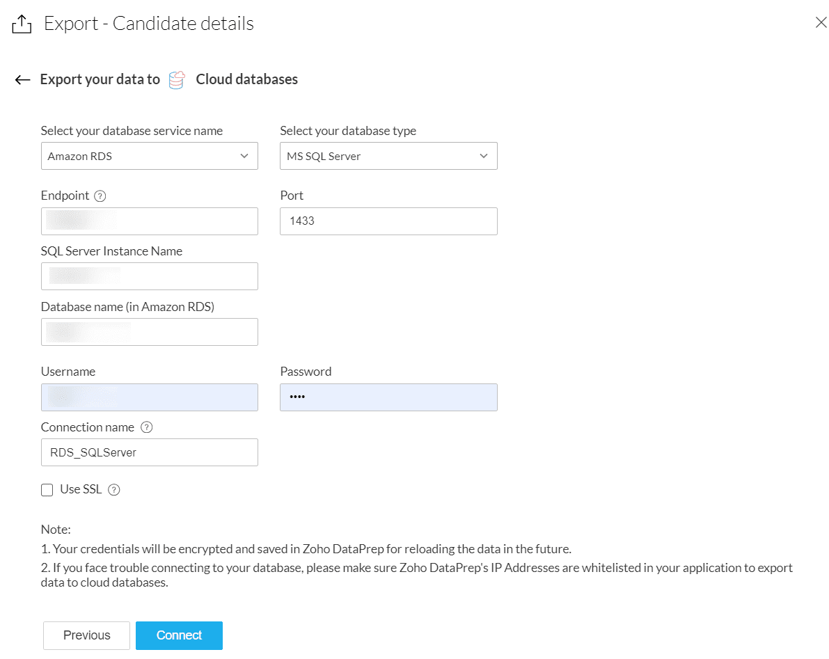 Note: If you face trouble connecting to your database, please make sure Zoho DataPrep's IP Addresses are whitelisted in your application to export data to cloud databases.