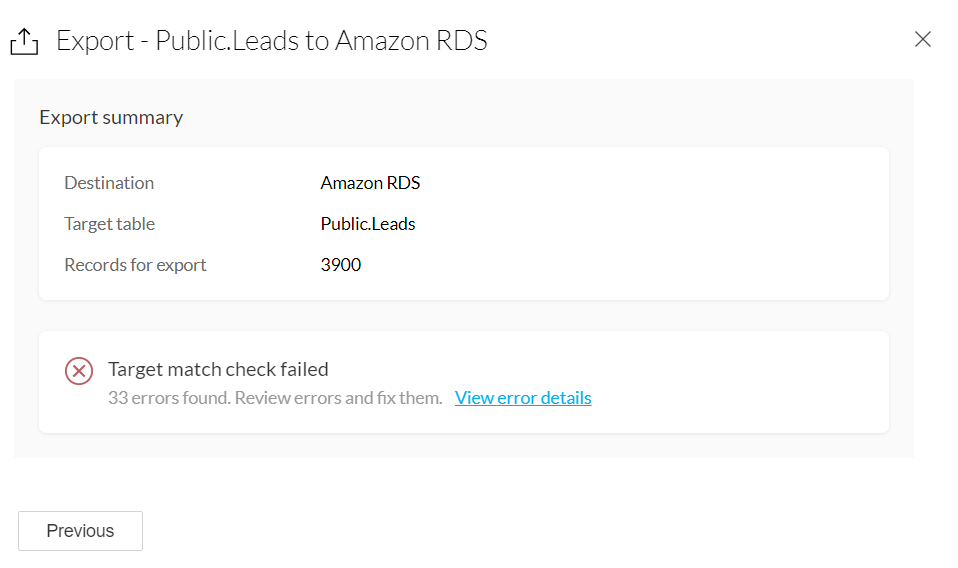 1. If the target match check fails during cloud database export, you can click the View error details link from the Export summary pane to get an overview of the errors.