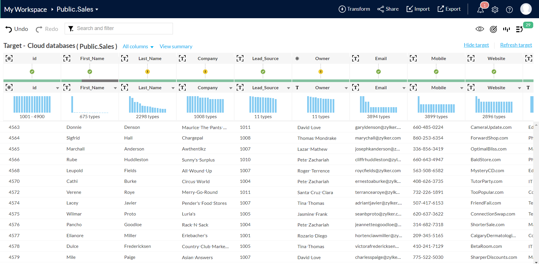 Target matching happens before the data is exported to the destination. Target matching is a useful feature in DataPrep that prevents export failures caused due to errors from the data model mismatch. Using target matching, you can set the required cloud database table as the target and align the source dataset columns to match with your target table. This ensures seamless export of high quality data to the cloud databases.