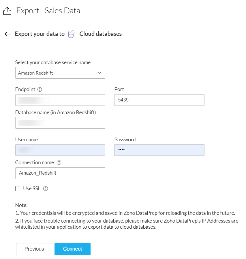 Note: If you face trouble connecting to your database, please make sure Zoho DataPrep's IP Addresses are whitelisted in your application to export data to cloud databases.