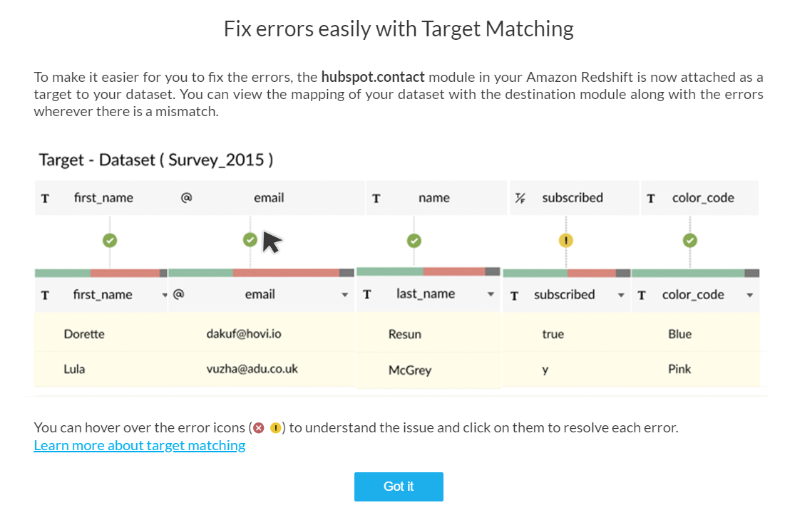 To make it easier for you to fix the errors, the target module in your cloud database is attached as a target to your dataset. You can view the mapping of your dataset with the table in the DataPrep Studio page along with the errors wherever there is a mismatch. You can hover over the error icons to understand the issue and click on them to resolve each error.
