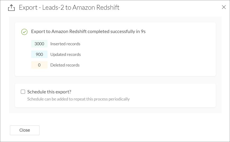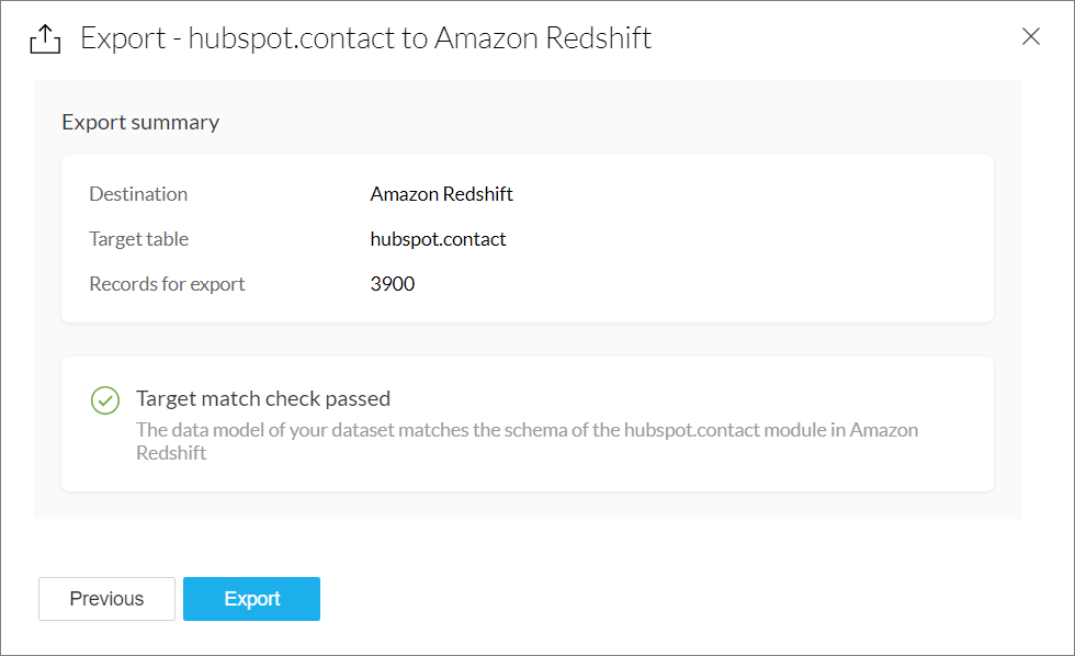 a. Click Export to view the Export summary. The summary consists of details such as the destination, target table, number of records to be exported, and the target match check result.