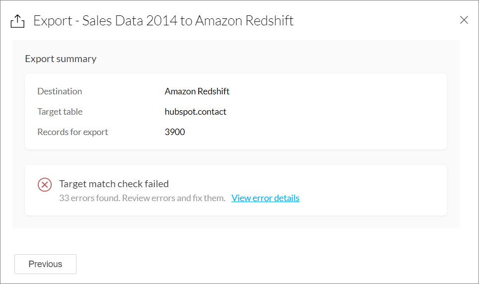 1. If the target match check fails during cloud database export, you can click the View error details link from the Export summary pane to get an overview of the errors.