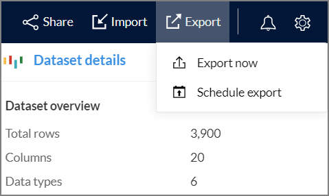 1. Click the Export now option from the Export menu on the DataPrep Studio page.