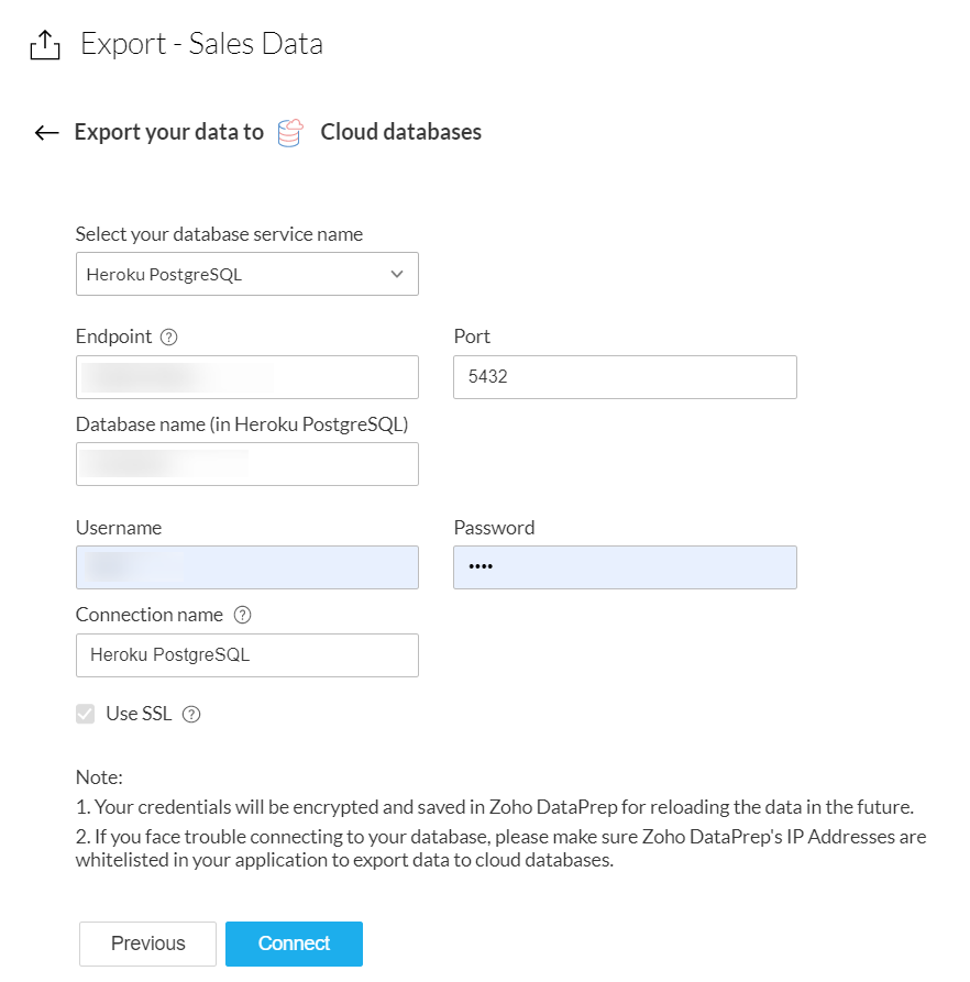 Note: If you face trouble connecting to your database, please make sure Zoho DataPrep's IP Addresses are whitelisted in your application to export data to cloud databases.