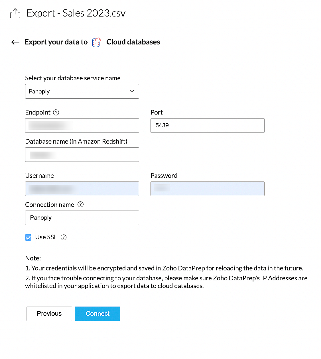 7. Once you have successfully connected to your Panoply account, you can choose how and where to export the data.