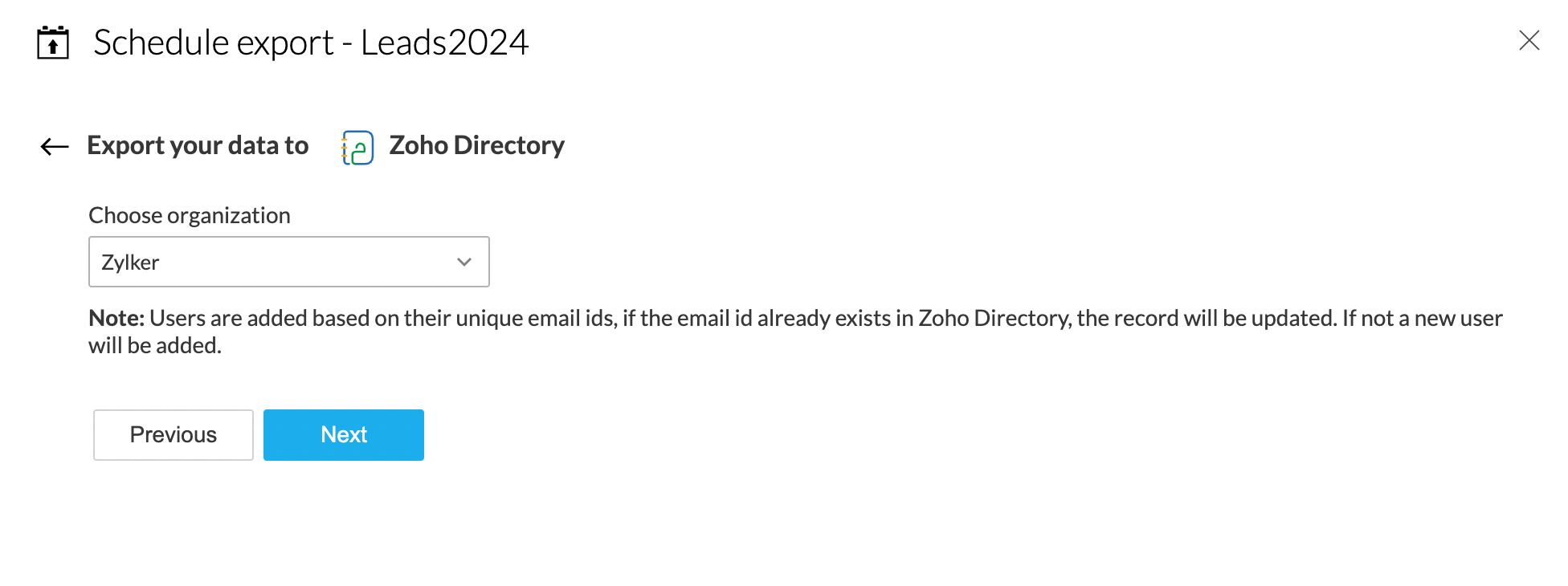 The user records are exported to Zoho Directory based on their unique email ids; if the email id already exists in Zoho Directory, the record will be updated. If not, a new user will be added.
