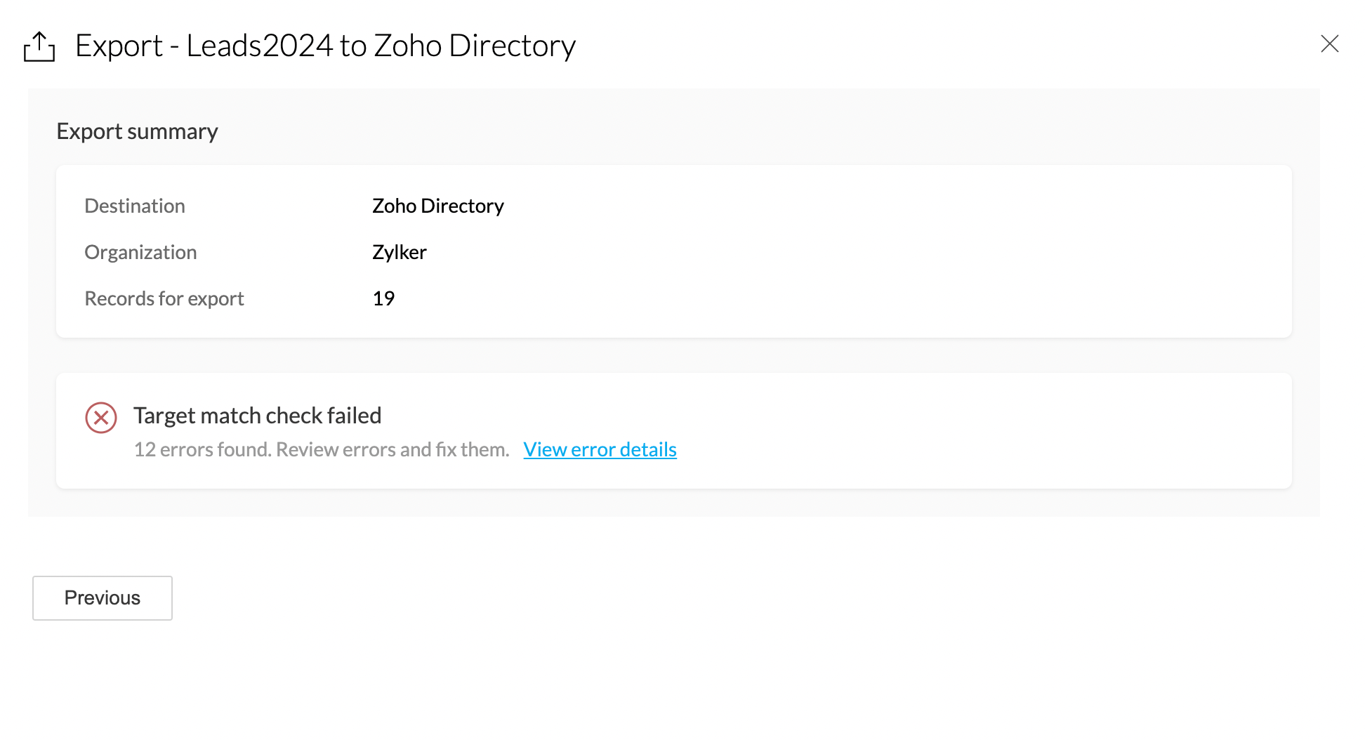 1. If the target match check fails during Zoho Directory export, you can click the View error details link from the Export summary pane to get an overview of the errors.